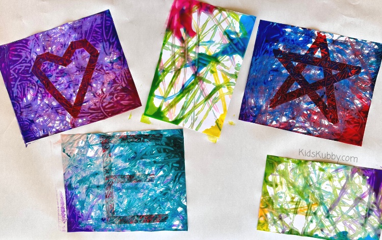 Set up is the same as the instructions above. The only thing you’ll do differently is use masking or painters tape to create shapes, pictures, or designs on your paper BEFORE you start painting. Make sure to cover the entire paper with marble painting so when you pull the tape off later, the shape/design is clearly visible!