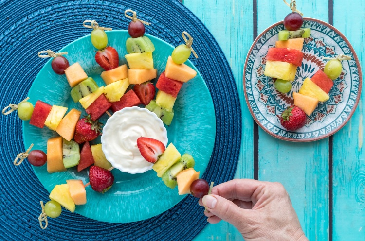 - Cut assorted fruit into bite size pieces and slide onto a wooden skewer in any order. This is a fun activity for kids to do!